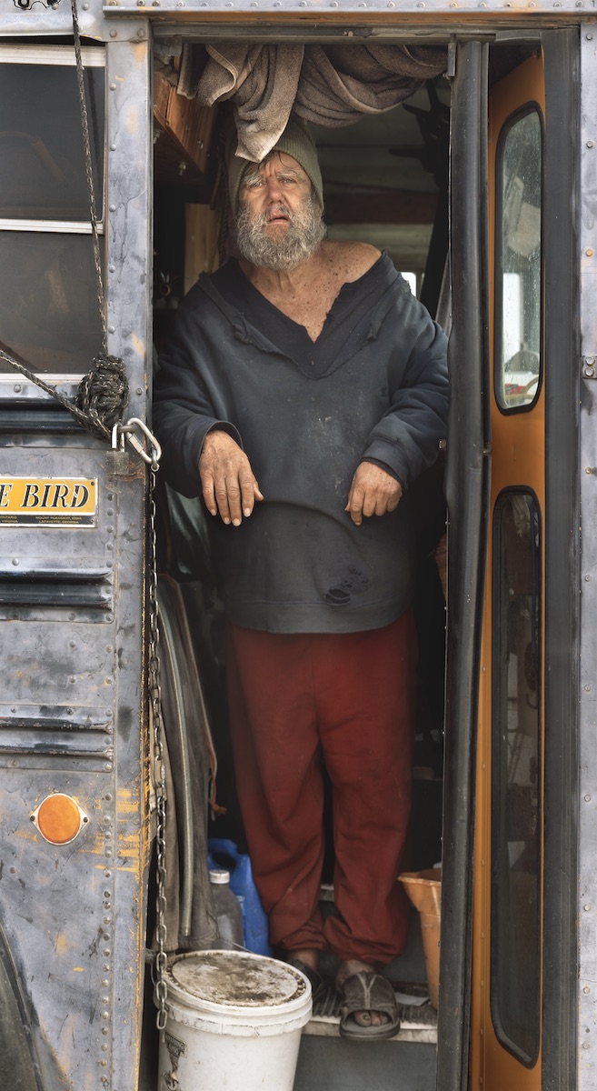 Discarded #5, Near Brawley, California is part of a more recent series consisting of thirty large-scale color photographs that investigates how Americans discard what they no longer need or value, including buildings, memories, and people. Hernandez took these photographs in the east and northeast regions around Los Angeles from 2012 to 2015. Here, he captures the aftermath of a post-recession California represented by abandoned real estate, deserted valleys, and, in the case of Discarded #5, an elderly man living in a bus. “Some people ask, ‘What’s so important or compelling about taking pictures of such unpleasant subjects like city dwellers?’… My work may be beautiful or it might not be, that just isn’t what I am concerned with. I try to be open and face the city… . To me it’s not unpleasant or unbeautiful, it’s just life—which has to be threatening sometimes if it is going to be interesting,” says the artist.