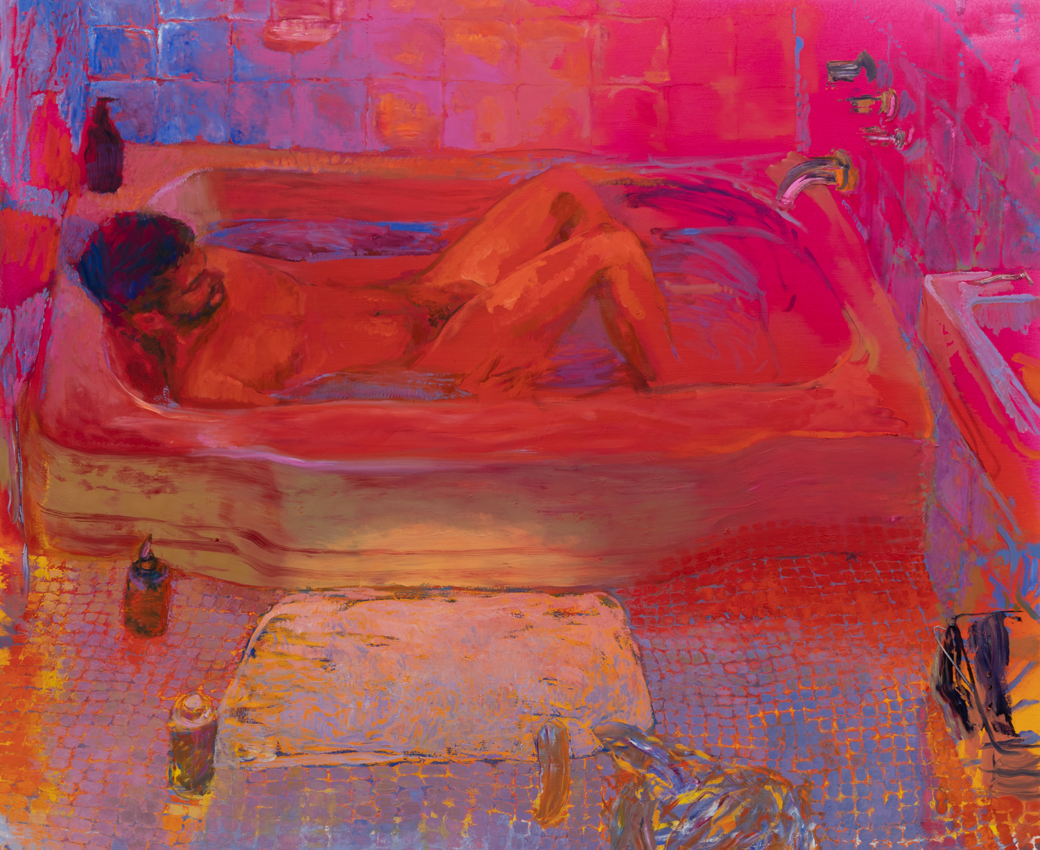 Langberg’s process begins with small, observational studies made of graphite, oil paint, and colored pencil, which he translates into large-scale paintings. Rich with texture and color, the finished canvases evoke atmospheric moods that often privilege private, domestic moments and intimate gestures. Bather depicts a man immersed in a bathtub filled with water. Details such as various bottles and the rumpled clothes on the floor complete this everyday scene. A common subject in the history of art, the bather has appeared in the works of many artists, from Titian to Paul Cézanne, who frequently portray women bathers in idyllic landscapes or classical scenes. In this case, Langberg specifically references the French artist Pierre Bonnard’s painting Bather (1935), but importantly replaces Bonnard’s woman figure with an equally intimate portrait of a man—a continuation of Langberg’s centering of queer experiences and his commitment to expand the representation of queer sexualities. Speaking about his work the artist says: “Queerness for me is not just a sexual experience, but a way of being in the world which affects every aspect of my life. Using intense colors and different paint textures and marks to create these everyday scenes, I want to connect with a viewer by speaking to our most basic commonalities—our bodies, our relationships, our interiority—rather than the social categories that may separate us. In creating this connection, I want to make queer pleasure, friendship, and intimacy feel expansive and generative, embodying the full range of human experiences.”