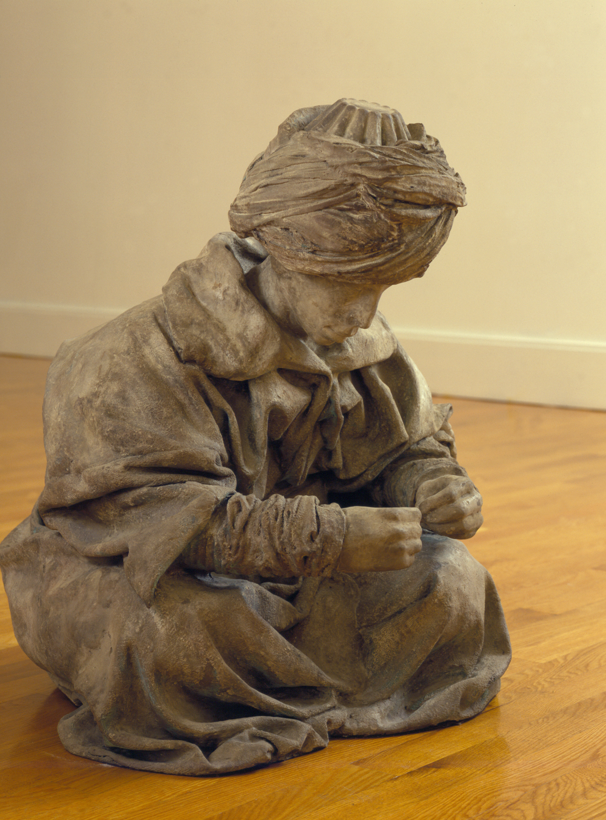 Casting realistic, slightly under-life-size human figures in bronze, Spanish sculptor Juan Muñoz (Born 1953 in Madrid; died 2001 in Ibiza, Spain) was interested in the transitory moments when the viewer contrasts what is recognizable from what is unknown to create, in his words “a wide distance between the spectator and the object.” During a four-week residency in 1995 at the Isabella Stewart Gardner Museum in Boston, Muñoz created a series of objects that responded to a work in the museum’s collection, the Gentile Bellini miniature Portrait of a Seated Turkish Scribe or Artist (1478–80). Muñoz’s Portrait of a Turkish Man, a larger representation of the seated scribe, draws from a speculative narrative developed in the drawing. Other works included in the Gardner exhibition was a sound installation that involved a stereo speaker floating in the Muddy River across the street from the museum. The speaker, visible from the second-story window of the Early Italian Room where Muñoz’s sculpture was installed, transmitted a voiceover from an Arabic speaker, transforming Muñoz’s sculpture into an open-mouthed vessel.