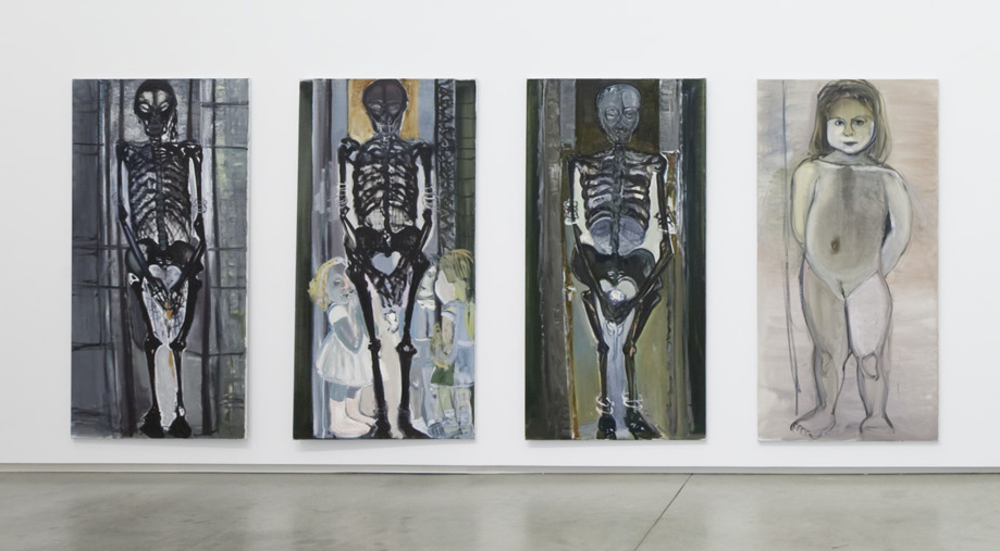 The Messengers reveals the fragile cycles of life in a four-panel painting that depicts three skeletons alongside a young child. While the anatomy is not detailed, Dumas creates a compressed intensity by scaling her figures to the height of the narrow canvasses and installing them close to the floor so they share our viewing space. Dumas made this painting when she was a new parent: the figure to the right is her daughter Helena. In contrast to the three small children sheepishly crowding around one of the skeletons, Helena turns her larger-than-life gaze directly toward us. Images of pregnant women and children recur in Dumas’s work, and Helena is a frequent subject. The Messengers is typical of Dumas’s way of suggesting that motherhood and childhood are not as distant from issues of mortality as we might think. The size and postures of the skeletons and Helena are the same, and the skeleton beside her holds a small figure near its pubis as though it had just given birth; the association emphasizes the inexorability of the cycle of life and death.