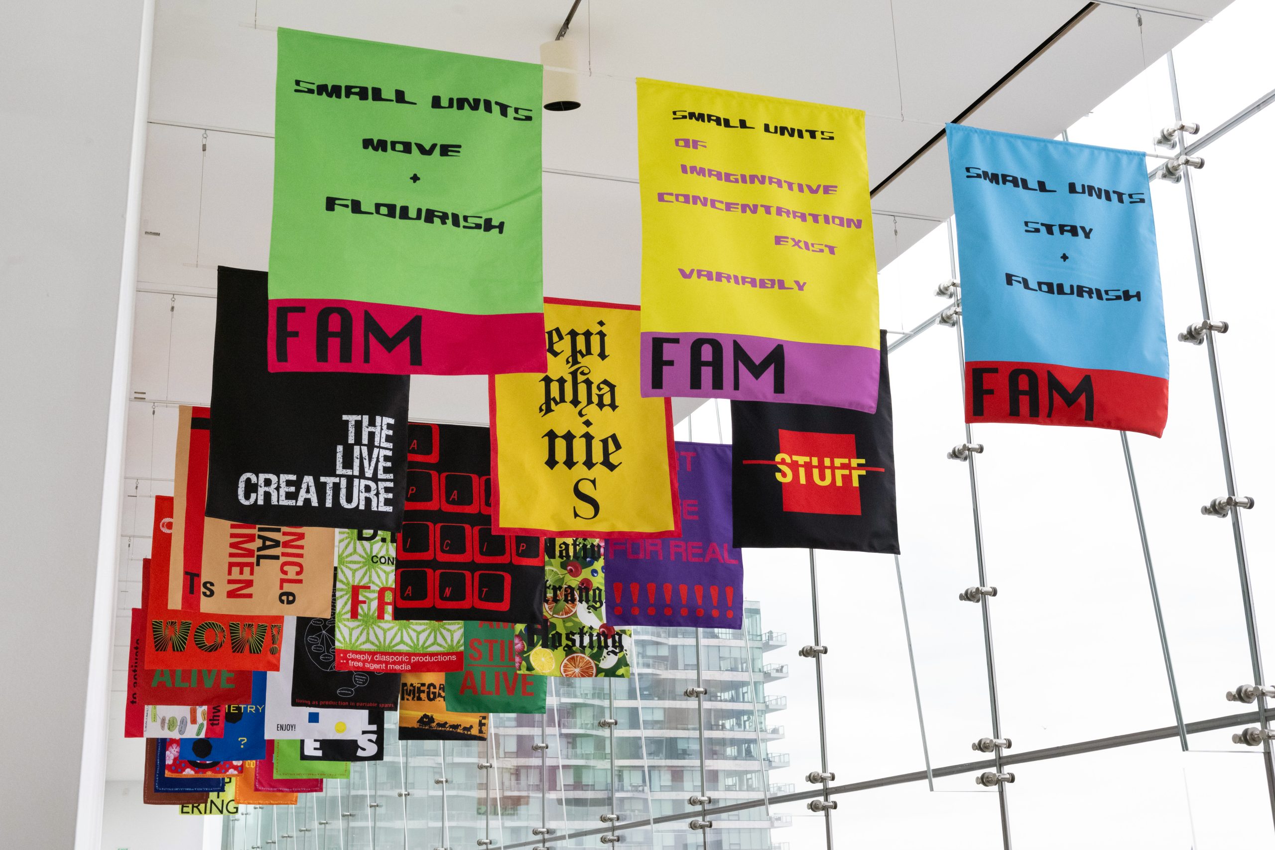 Artist, filmmaker, and writer Renée Green (Born 1959 in Cleveland) is known for her densely layered artworks, from room-filling multimedia installations and essay films to sound-based works and photographs. Green’s restless approach is informed by what has been referred to as a “methodology of citation,” bringing her work into conversation with an ever-expanding group of artists, writers, architects, and more, as a way to situate her own life and experiences. In 2007, Green began making colorful hanging banners emblazoned with expressive designs, poetic phrases, and evocative names of people based on the visual language of lamppost advertisements. These Space Poems, as she calls them, are a way of organizing her thought processes at a given moment, combining her wide-ranging intellectual pursuits and patterns of associative thinking with her interest in printmaking, design, typography, and a conceptual approach to space.