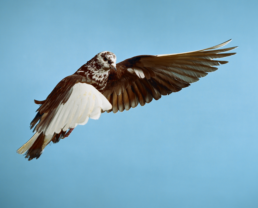 Untitled is part of a series of images of pigeons that Ethridge began in 2000. Using a high-speed flash, he captures the bird mid-flight. Connected to the history of photography, specifically the photographic experiments investigating animals’ motion conducted by Étienne Marey and Eadweard Muybridge, Ethridge’s series appears to monumentalize and eternalize an ordinary urban animal. The pigeon depicted, however, is no ordinary bird, but a trained “extra” rented from Universal Studios, set against a studio backdrop that mimics the blue of the sky.