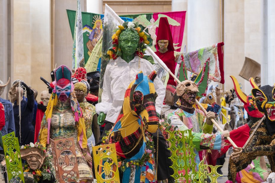 A procession is part of life; we gather and move together to celebrate, worship, protest, mourn, escape, or call for change. These expressions are all at the heart of The Procession, which features a gathering of over 100 life-size figures of all ages and abilities. Intricately handmade and adorned in printed fabric, patchwork, and appliqué, these spectacular figures embody visual references to colonialism, globalization, conflict, ecology, and cultural exchange. “They’re moving into another life,” says Hew Locke. “They may be coming from difficult times, they may be heading towards difficult times, but there’s an energy there, which is about hope.”