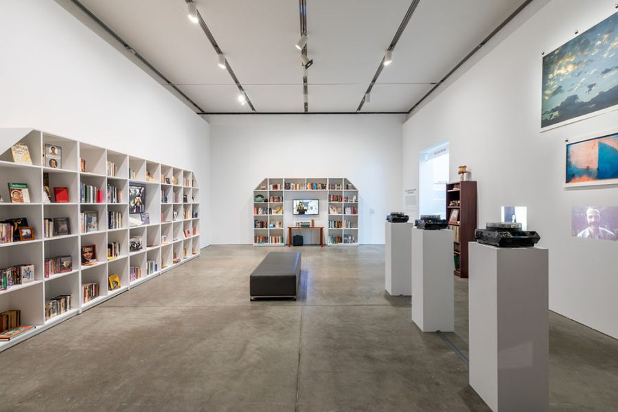The final gallery presents Dell Marie Hamilton’s The End of Susan, The End of Everything, a multimedia installation encompassing Hamilton’s work with hundreds of possessions of the late art historian, Susan Denker, a longtime faculty member at the School of the Museum of Fine Arts. When Denker passed away unexpectedly in 2016, Hamilton inherited her friend and mentor’s many belongings. A room-filling work in three sections, The End of Susan, The End of Everything is modeled on the living room, study, and bedroom of Denker’s former Cambridge apartment. The installation—which aims to “map the unmappable,” according to the artist—enacts a creative exchange between the two individuals pointed at making a layered portrait of Denker rooted in their relationship, Hamilton’s own history and lived experience, and, frequently, her body. By engaging with the complex and innumerable material traces of Denker’s life and using her own body as a medium, Hamilton attempts to answer the question: How do we make meaning out of what is left behind after someone dies?