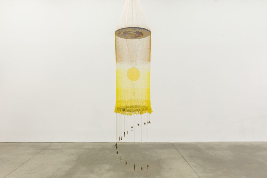 Carolina Caycedo, Flying Massachusett, 2020. Hand-dyed artisanal fishing net, artisanal fishing trap with floaters, hand-dyed artisanal hammock, traditional textile from the Zamboanga Peninsula in the Philippines, hand-carved wooden gold pan, hand-carved wooden boat, white shell, wooden needle, pebbles and stones collected from Boston Harbor, Blue Hills Reservation, and Neponset River, tin jingle cones, cotton thread, and paracord 93 x 166 x 23 inches (236.2 x 421.6 x 58.4 cm). Installation view, Carolina Caycedo: Cosmotarrayas, Institute of Contemporary Art/Boston, 2020. Photo by Mel Taing. Courtesy the artist and Commonwealth and Council, Los Angeles © Carolina Caycedo