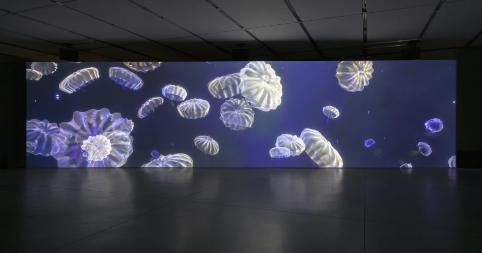 Wu Tsang, Of Whales, 2022. Installation view, Wu Tsang: Of Whales, the Institute of Contemporary Art/Boston, 2024. Photo by Mel Taing.