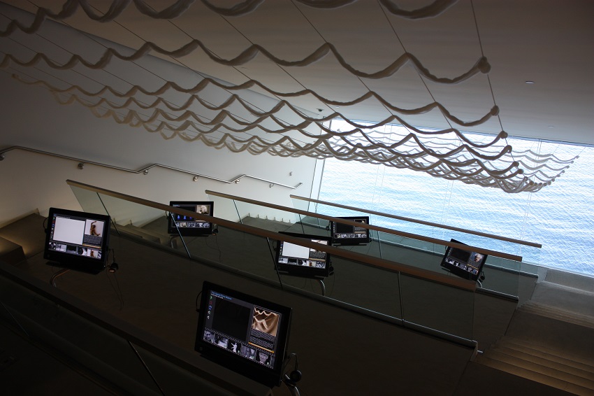 This vertically stepped-out space suspended from the underside of the cantilever features rotating interactive installations with resources to connect more deeply with current exhibitions on view. The space provides a stunning perspective of the water, framed as though through a viewfinder, with neither sky nor horizon in sight.