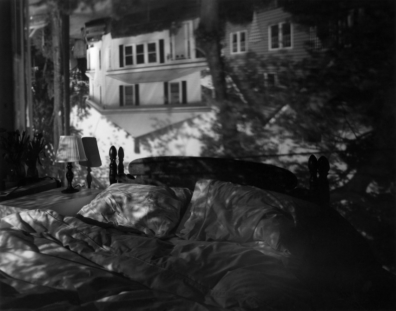 Camera Obscura: Houses Across the Street in Our Bedroom, Quincy, Massachusetts is an early example of what has become Morell’s signature approach. By covering his bedroom windows with black cloth into which he cuts a small hole, Morell creates a camera obscura, an optical technique from ancient times that is often touted as one of the origins of photography. In the final image, the facades of two houses and foliage from trees are cast upside down on the wall above a bed and nightstand. Made the first year Morell began to experiment with the technique, this piece demonstrates the poetic overlapping of public and private, exterior and interior, that would come to distinguish much of his work.