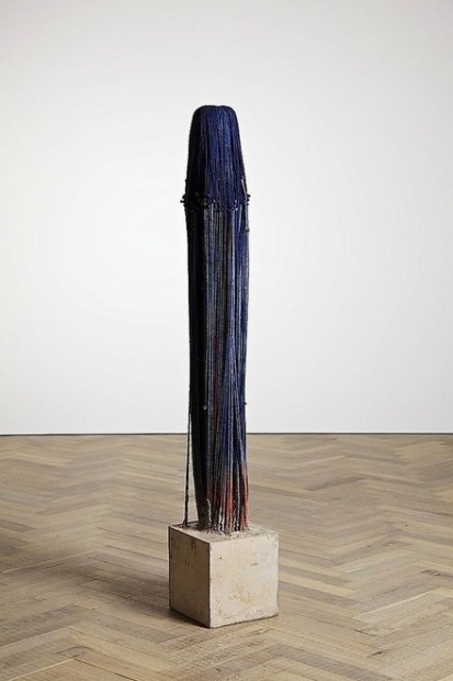 Of the many household items he repurposes—beach towels, skateboards, deck chairs, hockey sticks, canvas awnings, flowerpots, and straw hats—da Cunha works most extensively with mop heads. Bust XXXV is part of his first body of work based on the mop, the series Busts, 2008–12. In these works, long strands of dyed wool are knotted to the ends of upside-down mops, the handles of which are planted in concrete plinths. Da Cunha’s title for the series signals the figurative presence of the mops and links them to a classical genre of sculpture. Mops symbolize cleaning, a process that da Cunha considers meditative and reinvigorating, though their deployment also alludes critically to the labor conditions of domestic and janitorial workers worldwide.