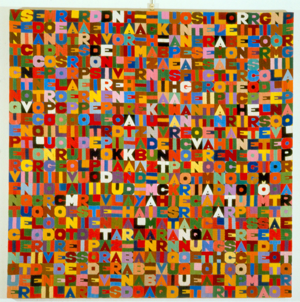 Alighiero Boetti (Born 1940 in Turin, Italy; died 1994 in Rome) was one of the most important artists associated with the Italian Arte Povera movement. Boetti sought to subvert traditional notions of authorship, dubbing himself “Alighiero e Boetti” (implying a partnership by adding “and” between his first and last names), as well as pioneering collaborative relationships with the fabricators of his work. He is perhaps best known for making embroidered works that feature words, numbers, and maps. These works, which first emerged in the 1970s, addressed a new sense of internationalism and global systems of power and authority as represented by flags, symbols, national borders, and language.