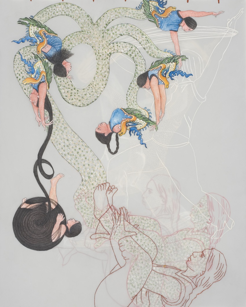 Multiplicité depicts a heroine in multiple, as iterations of her character emerge from the mouths of a five-headed dragon with arms in motion and a resolute expression. A spool of hair spiraling around the body of one figure is formed of her own tresses joining those of another. At the lower right, the green and white dots of the dragon’s scales cover our cloned heroine’s skin, blurring the distinction between her and the hydra: did the monster beget her, or vice versa? Butt creates further ambiguity at a formal level, borrowing from Persian painting both the demon figure and the technique of stitching, while deconstructing their traditional use. Here, rather than binding together pages, thread has entered the drawing itself, outlining the contours of the female figure from which the image of the dragon emerges.