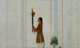 Inspired by wasli, the traditional method of laminating sheets to create a single strong surface on which to paint, Butt’s sewn pages create an illusion of spatial depth and phased passage of time while maintaining the thinness of the page. The exquisite and careful detailing allow Butt to explore the visual relationships between symbol, line, color, and scale, often as a personal response to social and political events. “I try to find multiple ways to decode or unravel that personal language,” explains the artist. “In order to fulfill that ultimate need, I use both figuration and abstraction in a platform that is purely my own.”