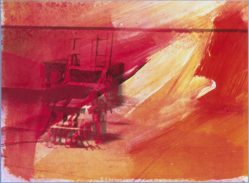 Warhol’s Electric Chair prints depict an unoccupied electric chair in an empty room. The image was appropriated from a press photograph from January 13, 1953, of the execution room at Sing Sing Correctional Facility in New York State. The room and chair, devoid of human presence and utterly still, convey a sense of death and absence. Warhol had already explored these themes in his Death and Disaster series of paintings and prints, which he began in the 1960s, screenprinting reproductions of car crashes, suicides, and other tragedies illustrated in newspapers. Unlike the subdued colors of silver, gray, and black he often used in these earlier images, the ten Electric Chair prints are rendered in the bright colors of pop: orange, purple, pink, red, and blue. The combination of jubilant colors and difficult subject matter registers Warhol’s notorious deadpan persona, which enabled him to avoid being pinned down.