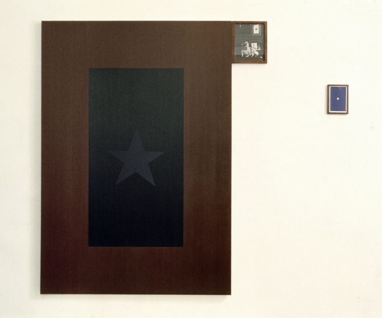 In Homecoming, Lemieux has compiled a mostly monochromatic assemblage of visual references to mid-twentieth-century wars. A large canvas is painted as a flag, with one gray star centered on black and brown rectangles. A framed black-and-white photograph hanging adjacent to the painting features a middle-aged woman sitting before a framed photograph of a uniformed man. On the wall of her home is a flag very much like the painted one. To the right of these two elements hangs another framed image—a blue sheet with a white star. The title evokes the homecomings everyone has waited for at some point in their lives, and may now remember with nostalgia. But for Lemieux, such wistful images also critique power structures, like those symbolized by flags, and the sacrifices made for the beliefs that the flags represent.