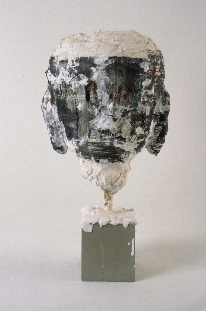 Essential Head was part of the ICA’s 2015 exhibition, Arlene Shechet: All At Once, and is an important early work by Shechet, emblematic of the artist’s sustained interest in East Asian art and the possibilities of chance. In 1983, Shechet visited the ninth-century Indonesian temple compound of Borobudor, one of the largest Buddhist monuments in the world. She describes it as “an experience of sculpture as a language for transmitting information, feelings, beliefs, and thoughts.” Ten years later, Shechet created a series of heads—including Essential Head—whose materials and visual vocabulary are similar to her Buddha-inspired sculptures she created during the same period. To make the heads, Shechet sets steel bars vertically into individually cast concrete blocks. As she grips the bar where it meets the base, she pours quick-drying plaster onto her clenched fist, grasping and forming with one hand while she continues to pour with the other. Through this process, Shechet plays with chance and emphasizes the physicality necessary to create the finished object.