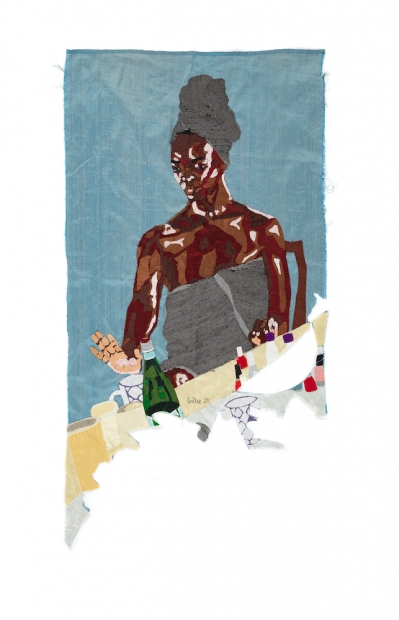 With Self-Care Sunday, Zangewa creates a stitched fabric scene of a Black woman protagonist at home. Composed of irregular silk samples, her character wears a towel and appears to be gazing at her freshly manicured nails. She sits at a dresser covered with various bottles of nail polish, as well as a coffee mug and a bottle of sparkling mineral water. Quotidian scenes are a primary focus for Zangewa, whose recent work recasts the gendered labor of homemaking as a political act for Black mothers in a white supremacist culture. Fragments cut from the canvas and edges purposefully left unhemmed suggest the undervaluation of care work and, in particular, Black women’s labor in a patriarchal society. The play of finished and unfinished components also contributes to the quality of storytelling in her works. Zangewa wields each of these technical devices to emphasize healing and re-creation, particularly in the recovery of feminine self-expression. “Society teaches us as women to be ashamed about ourselves, to feel self-loathing,” explains the artist. “I’m reclaiming my identity, my feminine power, and my significance in society at large.”