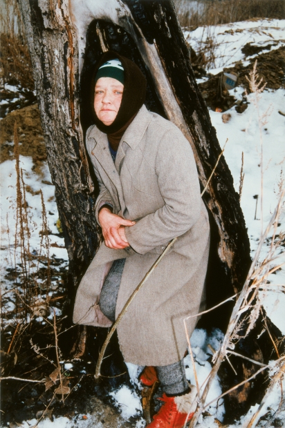 Mikhailov’s Case History series documents the homeless community that has appeared since the end of Communism in the Ukrainian city of Kharkov. In the late 1990s, he began photographing the so-called bomzhes, approaching them with his wife, Vita, and asking if he could take their photographs. The subjects, with tattered clothing and ailing bodies, bluntly reflect the economic deterioration of the post-Soviet era. Here, an older woman who appears in several photographs from the series crouches in a somewhat awkward pose in front of a tree. She looks cold in this wintry scene; her clothes are layered and threadbare, her gloveless hands clasped. In printing the image at almost life-size, Mikhailov confronts the viewer with his subject’s grim reality. Even so, her piercing blue eyes look straight ahead with a steady, sure gaze, never fully revealing what must be her daily struggles. Mikhailov’s Case History photographs expose a reality that most do not see or would rather ignore; they archive a community and a reality that would otherwise be erased, like so much of the suffering during the Soviet era.
