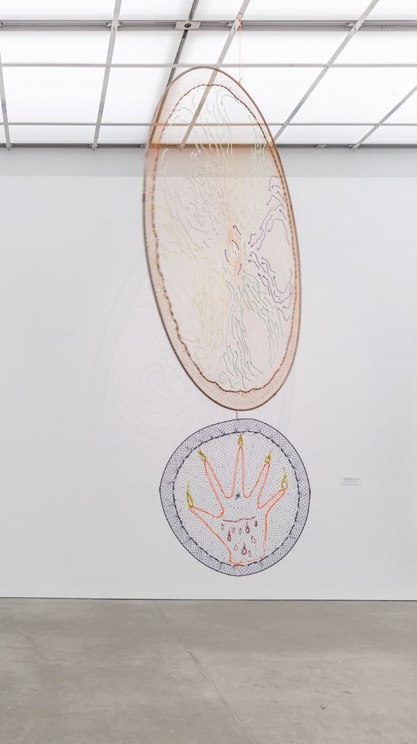 For Currents, Fire and Blood, one component of the Cosmotarrayas series, Caycedo combined two nets to make a single, large-scale work. The two colorful nets each function as a canvas for Caycedo’s embroidery. One net is illustrated with symbols used in cartography to depict water currents, and the other depicts a hand with drops of blood on its palm and flames coming from its fingertips. Through this evocative symbolism, the artist considers Currents, Fire and Blood “a call to action” in the struggle for environmental justice. Like other of the Cosmotarrayas, Currents, Fire and Blood embodies the continued resistance to corporations and governments seeking to control the flow of water and works to create visual narratives that counter the supposed neutrality of dams.