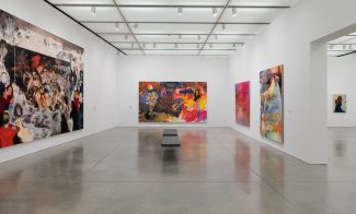 Rapone began Pack Animals with a specific color: the bright, rose pink that was her grandmother’s favorite color. From there, the artist drew from memories and individual experiences, working out the composition, patterns, and figures on the canvas without preparatory drawings. In this work, three nearly identical female-presenting figures—who appear to be wearing the same masked expression and hairstyle—gather on matching plaid blankets on a brilliant autumn day, a time of year the artist associates with the start of school and new beginnings. The three figures stretch and twist their bodies beyond realistic proportions and standard perspectives to give the painting a distinctive composition and sense of humor. The painting is populated with a remarkable range of objects (such as a football, a tote bag from the Metropolitan Museum of Art in New York, a drone in flight, crocodile skin patterned boots, a pair of cleats, and a deflated soccer ball), which serve to inform viewers about Rapone’s subjects and her picnic scene. The individual attire and styling of each figure is cast against a fascination with fashion and trends. In both form and content, the painting displays the drama between the individual and group, or pack, as in the title. While the figures appear individually consumed in their own activities, they almost interlock with one another and the surrounding scene, which makes discerning their individual forms visually challenging.