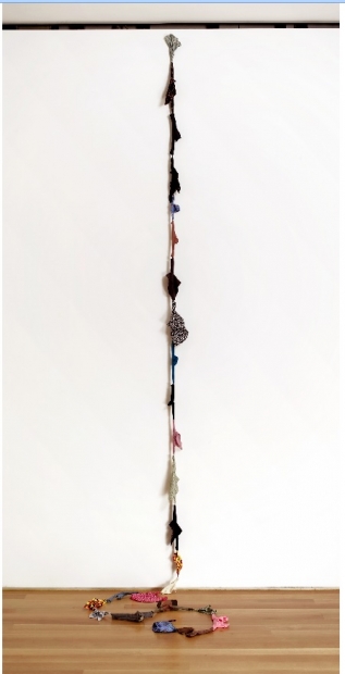 For LeDray, clothing is bound up with the history of identity, gender, and expression. Clothesline is an example of this interest through the layered symbolism of a stretched, hanging sculptural work suspended from the ceiling to coil on the floor. In this work, LeDray uses everyday objects and the intimacy of hand-stitched cloth. These doll-sized clothes hang from the ceiling in a striking downward line that pools into a swirling form on the floor of the gallery, though one might also expect that that stitched fabric threads are ascending upwards as much as they descend. With its miniature scale, realistic detail, and poetic reflections on individuality and collectivity, Clothesline demonstrates LeDray’s unique skill in reconfiguring expectation and exciting wonder in the everyday.
