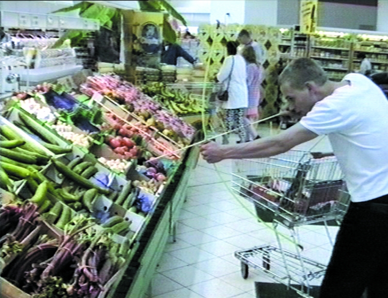 The Hunt, first conceived in 1992, is Jankowski’s most seminal early project, and the first of his videos to include the conceptual twists and self-reflexive humor that now define his mature practice. In this video, edited from weeklong filming, he tests the cliché of the “starving artist” while immersing himself in the realm of everyday commerce. The footage captures a young Jankowski’s quest to eat only groceries he shoots in the supermarket with a bow and arrow. The metaphors for striking success and survival as an artist are implicit. Amplifying the absurdity of “hunting” for shrink-wrapped, price-tagged products is the nonchalance of a cashier who rings up the arrow-struck items without reaction. The result is an amusing critique on the disaffected commercialization of securing sustenance, long a trope of high-adrenalin masculinity and honor in mythology and art history.