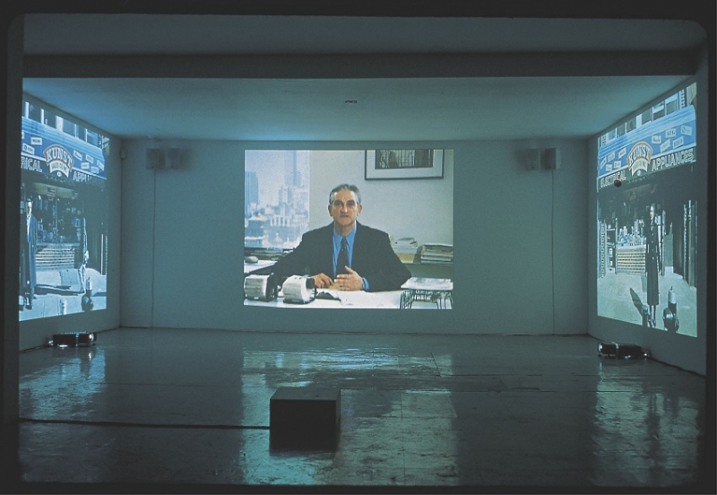 Point of Sale exemplifies the primary strategies of Jankowski’s practice: collaboration, crossover, chance, and critical wit. In the video, he has spliced together interview and video footage of three New York professionals in their workplaces to form a synchronized three-part exchange. Appearing on three separate channels are uptown management consultant Clayton Press; veteran electronics dealer George Kunstlinger (in his Chinatown shop, Kunst Sales, Inc.); and Jankowski’s art dealer Michele Maccarone (whose new gallery, maccarone inc., opened upstairs from Kunst Sales). Interviewing both Kunstlinger and Maccarone, Press questions, consults, and advises these neighbors on their respective clienteles, financial challenges, and business strategies. Meanwhile, Jankowski has arranged for the interviewees to deliver each other’s answers, effectively spotlighting the shared risks, challenges, and goals of their highly specialized ventures. As Jankowski’s first project for a commercial gallery in New York, Point of Sale plays on the overlapping location and vocation of two small businesses (their “point” of sale) while probing the wider intersection between art and commerce—and Jankowski’s own place in it.