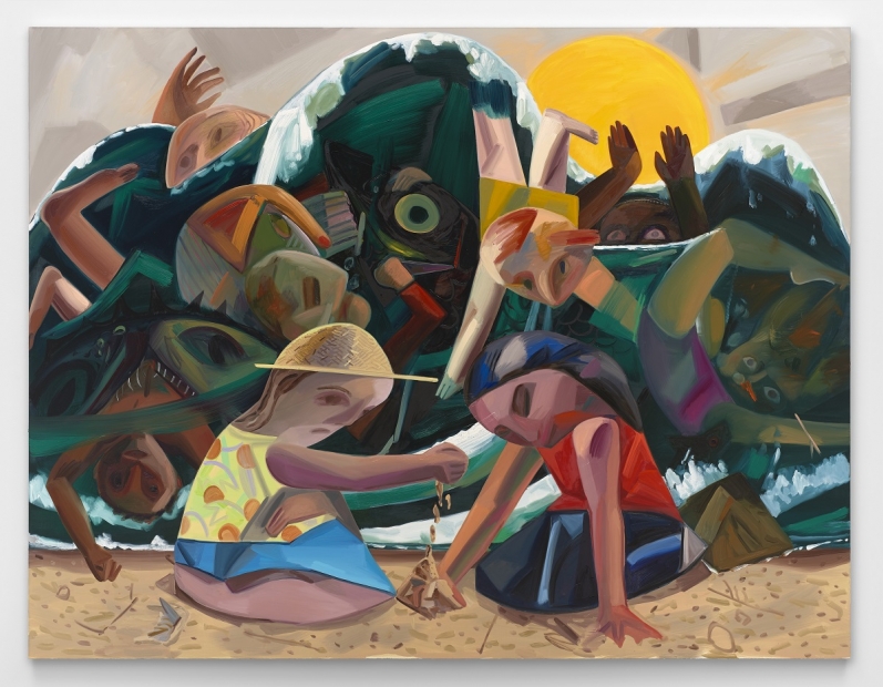 In the mid 2000s, Schutz began focusing her painting practice on tightly structured scenes in which subjects are compressed by the boundaries of the canvas. Big Wave exemplifies the artist’s spatial exploration. In the painting, two children kneeling on the shore build a sand castle, while seemingly oblivious to the drowning figures alongside of them. Multiple limbs, bodies, and giant fish are entangled in the tumbling, green wave. The juxtaposition of these two scenes with their distinct color palettes and energy levels creates two worlds within a flatly composed canvas, showcasing Schutz’s truly individual and inventive compositions. As evoked in Big Wave, Schutz explores what can occur within parameters of space and time, and how finite zones can unfold into anomalous and evocative narratives.