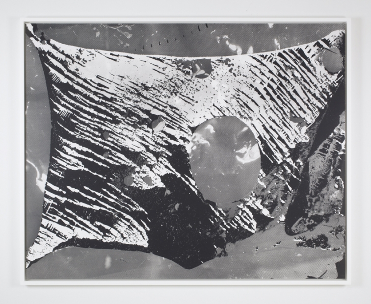 A Ground in the Air, whose title comes from a biography of the 19th century photographer Nadar, is a near-accidental composition combining multiple strategies. The artist shot a piece of canvas hanging on the wall with 4×5 Polaroid-type 55 film, and then manipulated the physical negatives to create the photograph. She etched on the negatives, stuck them together when they were wet, and then pulled them apart once dried, breaking the emulsion. The artist’s experimental process creates a palpable dynamism throughout the composition, particularly with the inscribed etches and the corners of this odd central “shape” pointing outside of the frame. The scratches and tears—both literal and visual—may echo Roland Barthes’ idea of the punctum in his seminal text Camera Lucida as something that grabs and affects viewers. A Ground in the Air, along with many of the artist’s other works, are more than what they appear, enticing you to consider and look closely as the work.