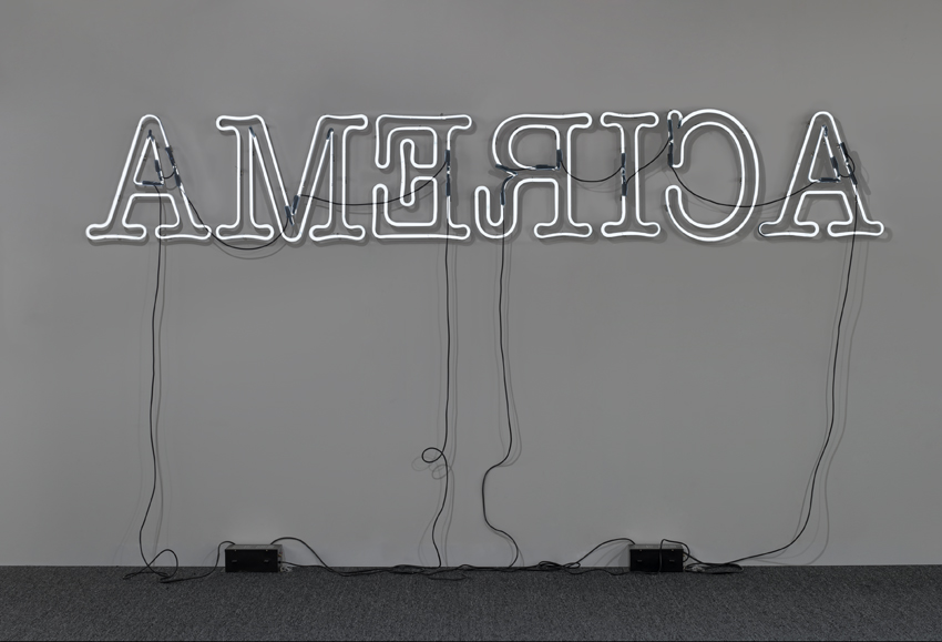 Rückenfigur is an important neon piece that was included in the 2011 exhibition Glenn Ligon: America at the Whitney Museum of American Art in New York. It consists of a neon sign, painted black. The title, literally “back figure,” is a German art-historical term for the Romantic device of depicting a subject from behind, often contemplating a grand landscape, as in the work of Caspar David Friedrich. Facing the same direction, the viewer can more readily identify with the subject’s experience. Ligon literalizes the title by placing the ostensible “front” of the neon sign against the floor, placing the viewer in the symbolic position of looking at the back of the vast and diverse landscape that is America.