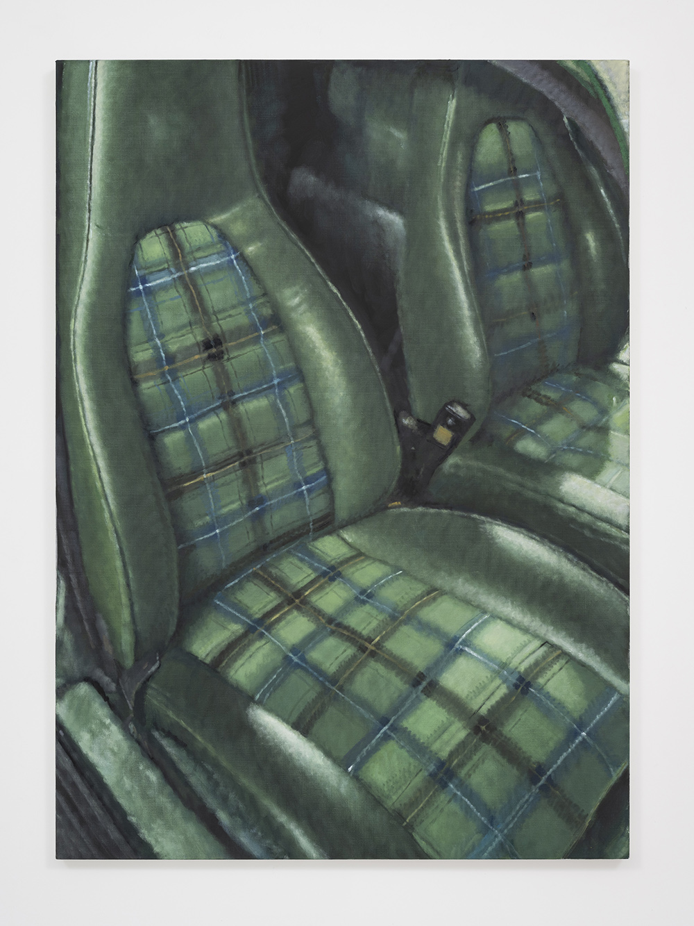 London-based Issy Wood (Born 1993 in Durham, NC) straddles realism and surrealism in her paintings of everyday objects with tightly cropped compositions and evocative details. She is also an electronic-pop musician, featuring her own paintings on the covers of her EPs and singles, as well as her debut album My Body Your Choice (2022). In Go Daddy! (Out to get you), Wood paints two bucket seats of a car’s interior from a peculiar angle. The car interior is a recurring subject in Wood’s paintings. She considers it a masculine space, presented through advertising as a kind of escape and frequently populated by men. Painted with great detail, this interior is cast with an eerie green color that, when combined with the perspective, renders the mundane scene as surprising and perhaps disquieting. Except for a glint of white light, Wood eliminates any context, segregating the scene from the outside world and highlighting it as a private space. This interplay between a common object and a sinister psychology recurs in Wood’s work, producing a sense of detachment and humor. Her distinctive treatment of banal subjects as well as her painting on clothing and furniture has distinguished her work in the field of contemporary painting, confirming her as part of the conversation around reinvigorating the traditions of portraiture and still life.