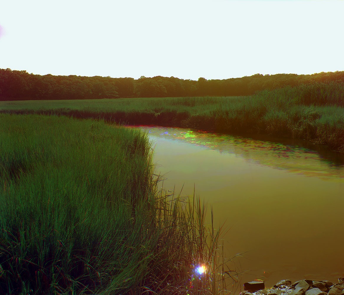 In 1997, Welling began a series of tricolor photographs, which are color images made through his use of tricolor filters, black-and-white film, and Photoshop. Inlet (which is part of this body of work), pictures Jarvis Creek, a curved tributary running through a reed-filled salt marsh in Guilford, Connecticut. It appears like a straight photograph of an idyllic landscape, and yet, when looked at more closely, subtle distortions appear. To create such images, the artist exposed separate sheets of black-and-white film through red, green, and blue filters, and then scanned these negatives and recombined them in Photoshop to create the final print. The ramifications of this process are most clear in areas of bright light, such as the sun’s reflection in the water, which appear to fracture into colored bands of pink, yellow, and blue. The tones reflect the four colors used to create all shades in digital inkjet printing—the process used to print this photograph. These visual artifacts of the process heighten a tension central to photography, between the reality of the subject and the acts of representation and reproduction, here called out specifically through the effects of light and color in the creation of the photograph.