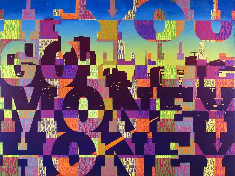 Boston-based Joe Wardwell (Born 1972 in Chapel Hill, NC) draws on the rich resources of music, landscape, and American culture in his colorful paintings. Combining layers of painted acrylic images and texts in vivid, chromatic hues, his work highlights counterculture narratives in American cultural memory and their relationship to nationalism, history, identity, and place. If You Got the Money Honey is from a cycle of paintings made by Wardwell in 2020 and 2021 in response to multiple intersecting crises of health, race, economics, and politics, and displays his signature layering of landscape and text. The artist’s first cityscape, this painting presents a view toward downtown Boston from Wardwell’s studio, located in Humphreys Street Studios in Dorchester’s Upham’s Corner. At the time, the studio building was threatened to be demolished by developers until Wardwell and other residents joined together to campaign against the sale of the building, ultimately reaching a unique partnership with the City of Boston and funders. Over this colorful skyline, the artist layers a series of texts. The largest text—lyrics from a Guns N’ Roses song—gives the work its title and points to the relationship between wealth and access, mounting an ironic charge against Boston’s increasingly unaffordable housing. For the smaller texts, Wardwell sourced quotations from cultural figures with ties to Massachusetts, including Malcolm X, Buckminster Fuller, and Donna Summer, screen printing these striking lines (“Integrity is the essence of everything successful,” and “Wrong is wrong, no matter who does it”) onto the painting. Through this matrix of text and landscape, Wardwell embeds multiple histories and evokes the collective and polyphonic voice of an urban environment.