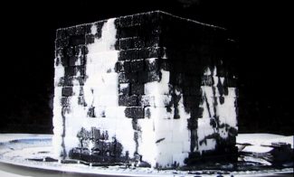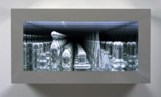 In Czech Modernism Mirrored and Reflected Infinitely, a line of eight polished decanters is viewed through a sheet of one-way glass that reflects the enfilade in what appears to be endless recession into a horizon-less darkness beyond the limits of our vision. A close look at the surface of each object reveals its own reflection, which itself contains another, like a Russian nesting doll. This vacuum of containers-within-containers completely bereft of our own reflection is a vision of modernism devoid of the human element. The seamless landscape of shining forms entrances our senses but denies our presence, hinting at the dangers of infinite absolutes.