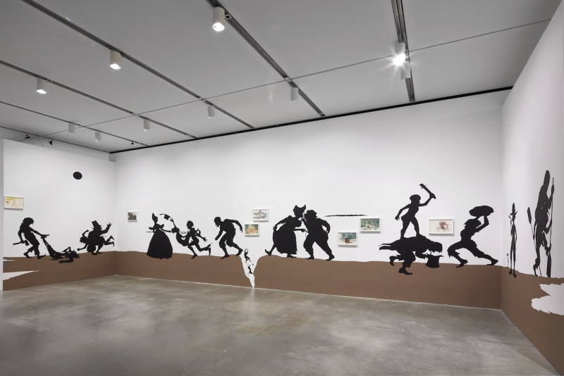 Though she works in a variety of mediums, from painting and drawing to light-projection and video, Kara Walker (Born 1969 in Stockton, CA) is best known for her room-size tableaux of black cut-paper silhouettes. A visual language introduced at her New York debut at the Drawing Center in 1994, the silhouette has become Walker’s signature means of interrogating the highly fraught histories of slavery, racism, and gender discrimination in the United States.