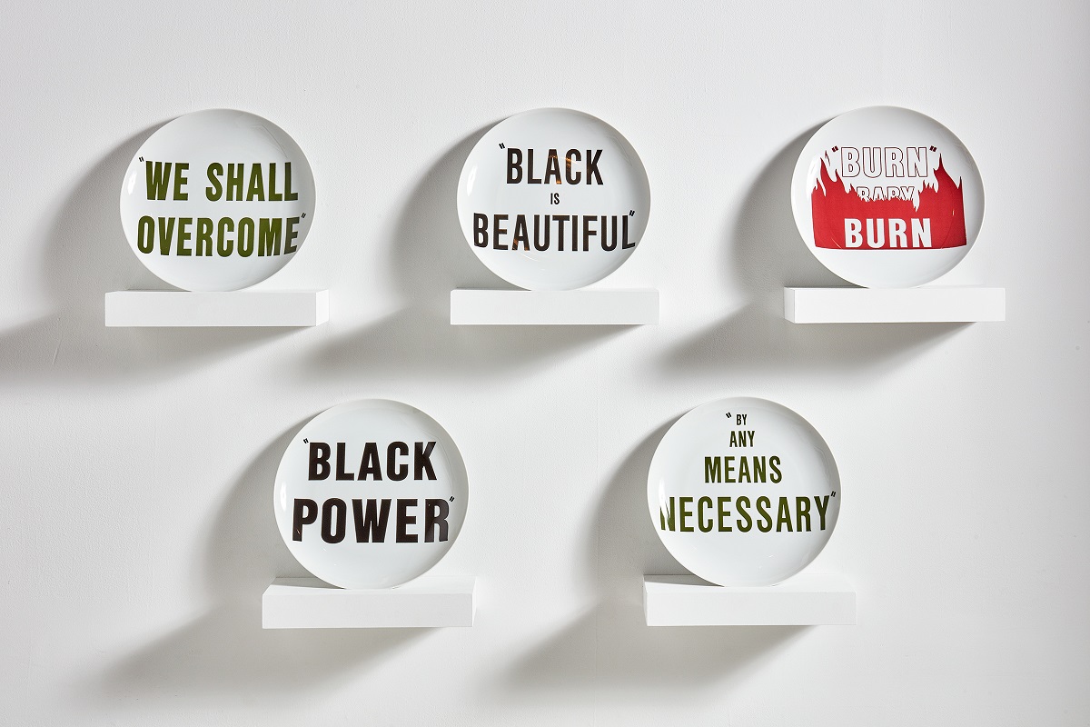 The five dinner plates in this set feature the texts “We Shall Overcome,” “Burn Baby Burn,” “By Any Means Necessary,” “Black Is Beautiful,” and “Black Power,” taken from a print series shown in Mementos, a 1998 solo exhibition of Marshall’s work organized by the Renaissance Society in Chicago, which traveled to the ICA/Boston, among other venues. The ceramic plates were produced as an edition to benefit the Renaissance Society. The affirmations they present are slogans popular during the 1960s Civil Rights movement, and they range in tone from peaceful to aggressive, reflecting the plurality of stances taken in the fight for equality in that era. In discussing the prints in his essay for the Mementos exhibition brochure, curator Hamza Walker considers them elegiacally, as “fallen monuments, tombstones even, to popular slogans which have lost their ability to galvanize the black community.” On benign, domestic plates, their revolutionary impact is perhaps further softened.