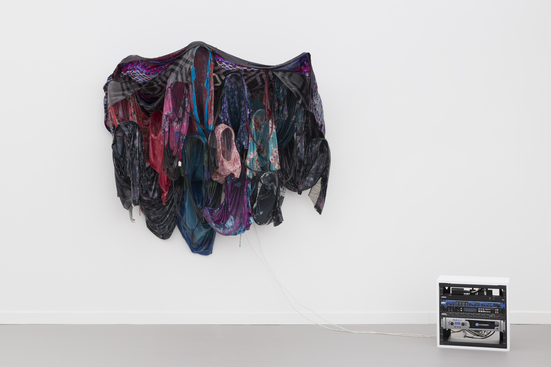 New York-based Kevin Beasley (Born 1985 in Lynchburg, VA) uniquely combines sound and clothing—his core artistic materials—in stunning, densely packed sculptures and immersive acoustic installations. His work involves the appropriation and recontextualization of found objects, sounds, and symbols to explore how personal memory and lived experience intersect with broader examinations of power and race.