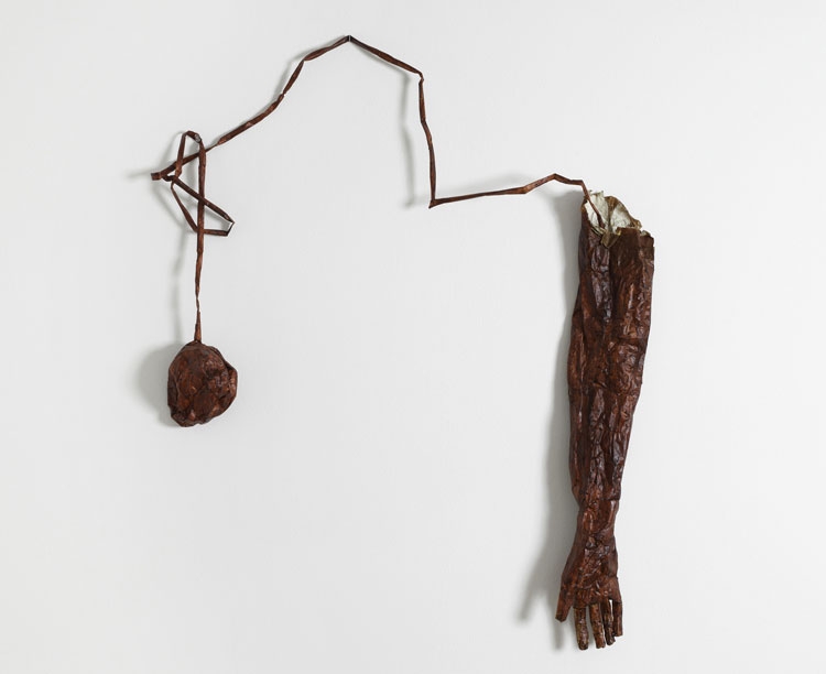 Throughout her oeuvre, Smith has often invoked bodily fluids, most notably blood and semen, to draw attention to the raw physicality as well as psychological pain, of human existence. The delicate paper sculpture Heart to Hand is an early work in which Smith externalizes internal processes, both psychic and physical. Red ink on gampi paper is manipulated to resemble wrinkled and bloodied viscera. The disembodied titular hand and heart hang freely on the wall, connected via a spindly red umbilical artery. While the sculpture makes self-referential allusion to channels of artistic creation, it also references Bruce Nauman’s From Hand to Mouth—a similar sculpture of a human arm and mouth that likewise seeks to represent the psychological divide between the manifest and the metaphoric.
