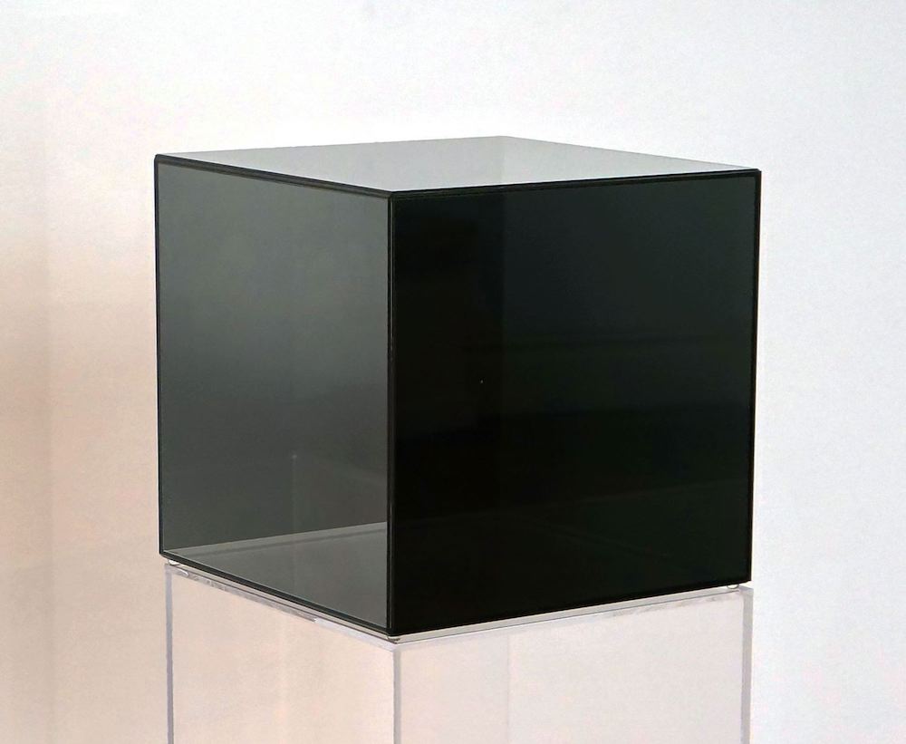 CUBE 27 continues Bell’s exploration of transparency and illusion through the application of metallic and nonmetallic coatings to glass. These coatings, such as Inconel—an alloy of nickel containing chromium and iron—are vaporized and applied through vacuum deposition, the same technique used to treat camera lenses, telescopes, and conductive surfaces in the optics, automotive, and computer industries. A contradictory object, CUBE 27 models the perceptual interference created by a discrete volume whose semireflective interior surfaces seem to betray another volume or lend a different shape to light.