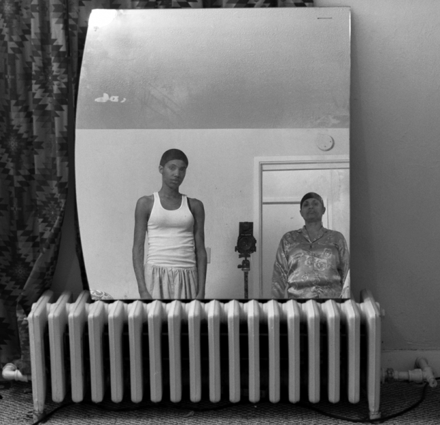 Mom Making an Image of Me is part of a 2008 series of double portraits of the artist and her mother posing in the family house in Braddock. Throughout the series, the artist provides minimal visual context—a metal heater or patterned curtains—to give a sense of the domestic space. Both Frazier and her mother are visible only in the mirror propped on the radiator. Between the two women stands the camera, a key third element in this triangulation. Just as Frazier and her mother are framed by the mirror, the image is framed by the room. Through her precise compositions and focus on the individual as well as family, Frazier visualizes complex relationships.