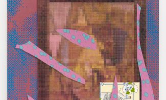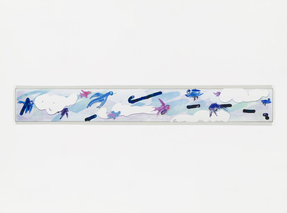 In Untitled, 2015, Owens uses computer software programs developed in the late 1990s to explore the equation of painterly brushstrokes and the pixel. To this, she adds images of birds—both painted and printed in low-resolution blurs—to create an allover composition. Much of Owen’s work is site specific, with size and subject matter influenced by the gallery’s architecture and context. Untitled, 2015, was designed based on an architectural frieze, creating an unbalance between the exaggeratedly lite subject matter and the permanence of architecture.