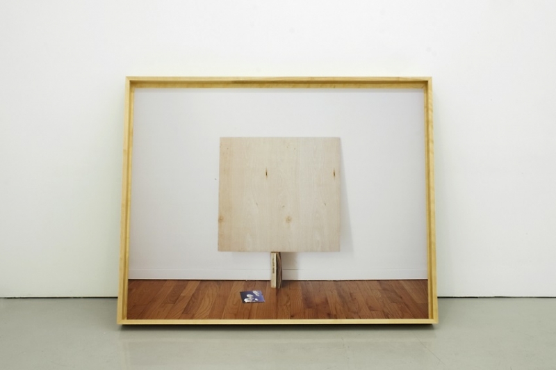 The series Blue Skies, Warm Sunlight consists of seven images, each containing a nearly sculptural composition of various objects, including books, photographs, and planks of wood. These subjects are arranged and rearranged, each work composed of an assorted set of subjects placed in varying structural forms. The work is both image and sculpture, as the large wooden frame leans against the wall, jutting out onto the gallery floor, the image/object interrupting the realm of the viewer. A mirroring occurs between the subjects in the image and the physical work itself.