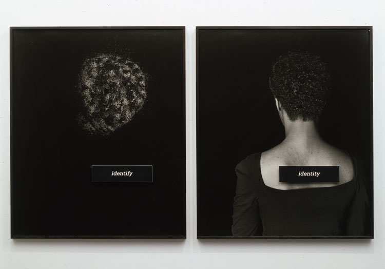 In ID, Simpson mounts a plaque engraved with the word “identity” over the photograph of a woman with her back turned to the camera, and another bearing the word “identify” below the image of what appears to be a section of her hair. Just one letter different, the two words cue a process of racial recognition and naming. The alignment of these words with the images conveys the commonplace and racially motivated act of drawing conclusions about black women from visual cues such as hair or skin color.