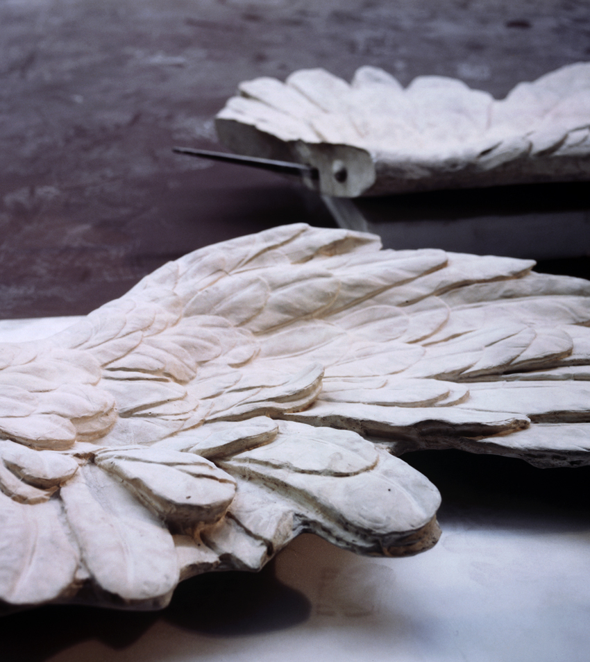 Grieving Mothers (Attachment) is part of a series in which Lawler documents casts of antiquities held by various international institutions. It depicts plaster casts of the wings of the Nike of Samothrace, c. 190 BCE, perhaps one of the most recognizable objects of Hellenic sculpture, in the collection of the Musée du Louvre in Paris. To further complicate the idea of originality and reproduction, the original marble has missing portions filled in with plaster. Lawler shows the wings detached from the figure’s torso, the mechanism of attachment visible. Due to the close cropping and angled framing, the viewer can perceive the wings as sculptural objects divorced from their grand and dynamic referent. In such pieces, Lawler complicates our perception of authenticity and its relationship to form.