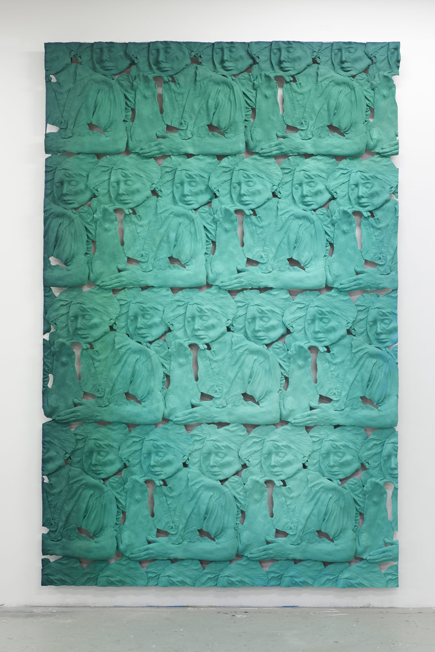 Kim’s painted wall sculpture, Dr. Melissa Doft, Plastic Surgeon 1 is the first in an ambitious recent series that captures the features of three people whose work alters the human body: plastic surgeon Melissa Doft (the subject of this work); Kim’s personal trainer, Stephen Marino; and Eric. S. Lander, a geneticist, molecular biologist, mathematician, and director of the Broad Institute of MIT and Harvard. After meeting Dr. Doft—a highly successful plastic surgeon based on New York’s Upper East Side, and collector of Kim’s works—the artist became interested in occupations that shift cultural perceptions of the body through its manipulation. Updating age-old ceremonial and artistic processes, her method involves a painstaking sequence of steps in which she casts a mold of the subject’s torso and face, uses Photoshop to create a surface pattern, and then constructs and paints the final work. These so-called “life masks” register an uncanny transitional state, lifelike yet frozen, unique yet multiplied, distorted yet descriptive. Drawing on traditions of religious and ceremonial sculpture, low-relief architecture statuary, and trompe l’oeil painting, these works hover between painting and sculpture, between image and object. By indirectly manipulating the body of each of her subjects, Kim creates an unsettling meditation on our fragile, mutable physical states.