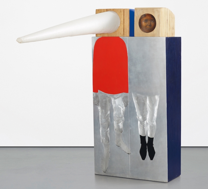 First exhibited in Marisol’s 1966 exhibition at Sidney Janis Gallery in New York, Couple No. 1 presents a pair of illustrated figures contained within a wooden block. The bright crimson top and the white fabric cone, which extends six feet into space with the help of a motor, distinguishes the figure on the left from the more spectral, carefully rendered, and feminine figure on the right. Shaded three-dimensional elements contrast with two-dimensional blocks of color, and the white-cone face contrasts with the more detailed face beside it, suggesting the duality of anonymity and individualization embodied not only by two people, and two genders, as the title might imply, but also by any single person. With remarkably minimal means, Marisol communicates an element of pathos in her rendering of the couple, which speaks to her skill and insight in representing the human condition.