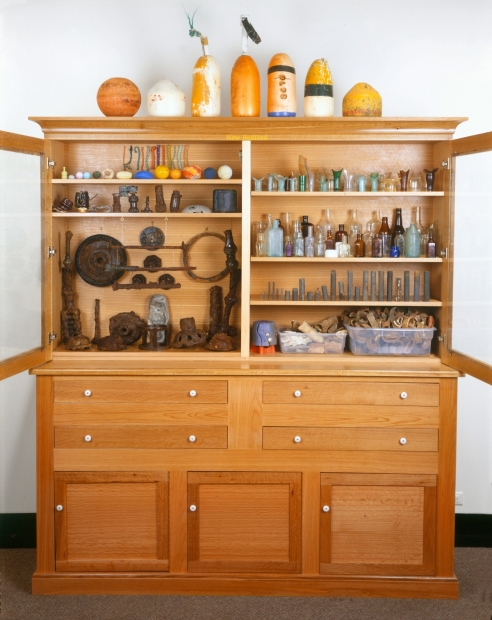New Bedford Cabinet is a large wooden cabinet of the classic Wunderkammer variety and comes from Dion’s New England Digs project, organized by the Fuller Art Museum in Brockton, Massachusetts. The beautiful cabinet displays hundreds of objects found during an archeological dig led by the artist in New Bedford, Massachusetts, which also happens to be the artist’s hometown. Dion has often said that the origin of his interest in collections and display came from combing the beaches of New England as a child, so this connection to the artist’s biography gives this work a special place in his expansive oeuvre. For New England Digs, Dion conducted digs in Brockton; Providence, Rhode Island; and New Bedford, collecting, cleaning, categorizing, and presenting his finds in handmade wooden cabinets. New Bedford Cabinet is exemplary of Dion’s practice, both his application of scientific approaches and his focus on display techniques to question forms of knowledge and practices of collecting. His intermingling of old and modern objects without attention to hierarchy reflects his own fictive version of history and perhaps encourages viewers to question contemporary institutions and popular ideologies that define today’s official narratives.