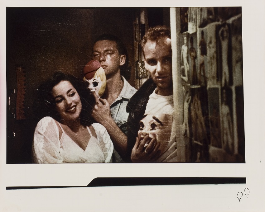 “Nymph-O-Maniac” Promo Still Spectacular Studios shows cast members of Morrisroe’s 44-minute, low-budget film Nymph-O-Maniac, which he shot with Super 8 film in the style of his idol John Waters. The photograph self-consciously captures the act of performance. The buxom female lead, Pia Howard, is posed in the hallway of her apartment where the film is largely set, conjuring celebrity shots of Marilyn Monroe. Two men beside her hold masks in their hands, and a collage of naked men—an expression of Pia’s sexualized persona—covers the right-hand third of the photograph. This “promo still”—a category that itself participates in performance—exudes a polymorphous abundance of masquerade and sex. To create the work, Morrisroe used a “sandwich” technique of his own invention, first making a color photograph, then rephotographing the picture in black and white, and finally superimposing the negatives to print the final photograph. This process results in deep shadows and a gauzy screen of scuffs, dust, and fingerprints, visually registering the bodily experimentation taking place among the subjects.