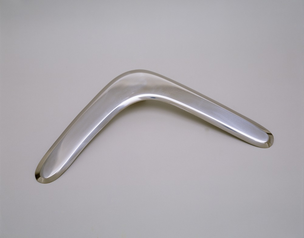 Do unto others… is a polished metal boomerang put on formal display in the gallery context. The boomerang originated in Australia as a tool for hunting as well as sport and entertainment. Hatoum’s gleaming sculpture eschews the warm organic wood typical of boomerangs in favor of surgical stainless steel, a material change that lends the object the appearance of a blade, scalpel, or scythe. The title refers to the golden rule “Do unto others as you would have them do unto you.” When thrown, a boomerang performs the operation detailed by the maxim by returning to the thrower’s hand. However, to catch this blade-like version of the boomerang would undoubtedly cause harm to the wielder. With Do unto others… Hatoum seems to suggest a negative invocation of the “golden rule,” a reading more akin to “an eye for an eye,” in which violent acts, and not good deeds, are reciprocated.