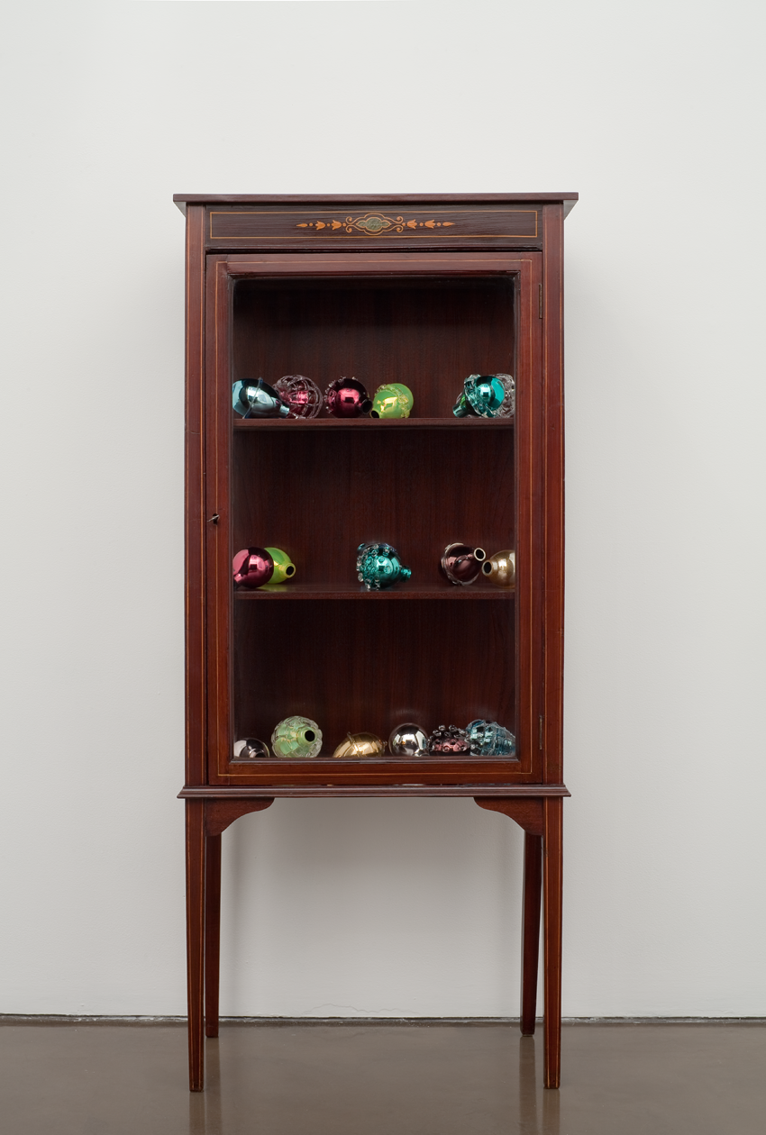 Natura Morta (Edwardian Vitrine) consists of beautifully crafted, colorful Murano glass objects arranged inside an Edwardian wooden cabinet. At first glance, the seductive mirrored-glass objects resemble crystal fruits—a pomegranate, a pineapple, or perhaps a lemon. However, these jewel-colored objects are blown and hand-shaped to resemble hand grenades, small bombs that disperse lethal fragments on detonation. By using a particularly seductive mirrored glass as the objects’ material and placing them inside a common domestic cabinet, Hatoum converts the appealing and familiar into the threatening and deadly. Her alienating treatment of the home arouses feelings of displacement that respond to the reality of many who live in the midst of constant war and violence.