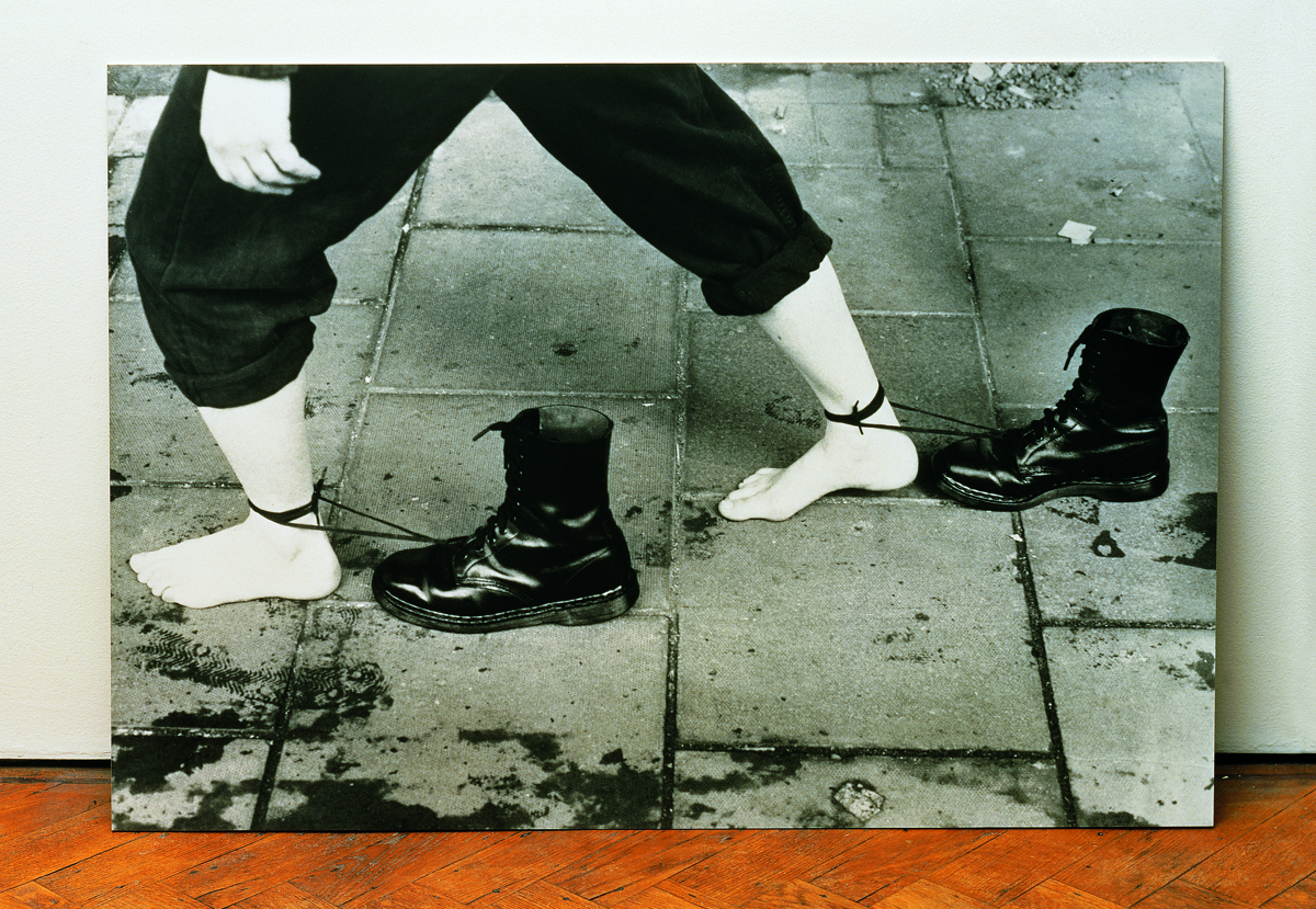 This photograph documents an early performance during which the artist trudged barefoot through the streets of Brixton—an ethnically diverse, working-class suburb of London—dragging heavy, black Dr. Marten boots tied to her ankles. This particular style of boots was worn by both the British police and skinheads, overt opponents during the racially charged history of early 1980s London. Hatoum’s bare feet allude to the vulnerability of ethnic minorities in face of the violence and discrimination of a public authority charged with community protection.
